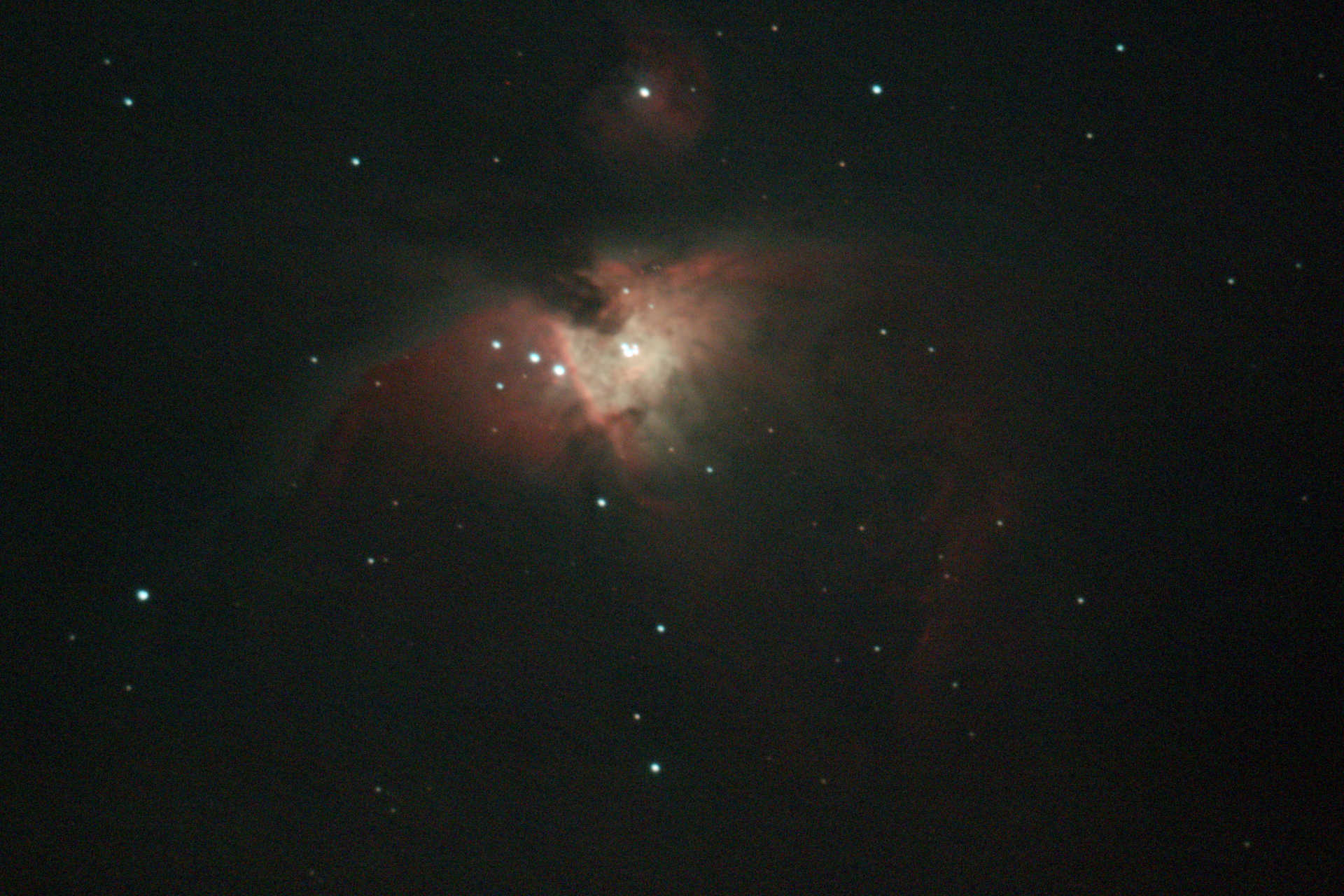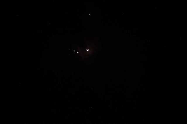Nun suche man sich ein möglichst helles Objekt, wie zum Beispiel den Orionnebel und fokussiert, via Zoom Funktion des Live-View Modus, so genau wie möglich. Achtung: Im Live-View werden meist nur die helleren Sterne und kaum Farben des Nebels sichtbar sein. Beim Orion Nebel im Speziellen, helfen die vier trapezförmig angeordneten Sterne im Zentrum, beim Ausrichten des Teleskops. Testfotos mit hohem (bzw. sogar höchstem) ISO, helfen dabei das gewünschte Objekt zu identifizieren.