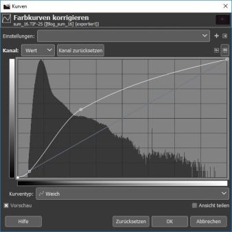 Unter Filter -> Verbessern -> Unscharf Maskieren kann man noch den lokalen Kontrast und die Schärfe verbessern (Radius 8, Menge 0.5, Schwellwert 0), wenn man mit einem Mehr an Bildrauschen leben kann.