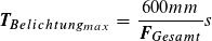 Nun muss die maximal mögliche Belichtungszeit gefunden werden, bei der Sterne noch nicht zu einem Oval oder gar einem Strich verformen. Dazu muss man die Gesamtbrennweite berechnen. Dies bestimmt sich anhand der Brennweite des Teleskops und dem Crop Faktor der Kamera: